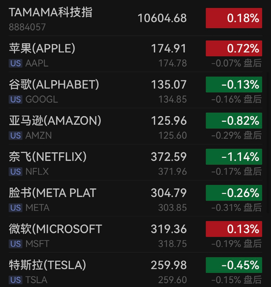周四科技股多数下跌,万得美国TAMAMA科技指数涨0.18%,苹果涨0.72%,亚马逊跌0.82%,奈飞跌1.14%,谷歌跌0.13%,脸书跌0.26%,微软涨0.13%,特斯拉跌0.45%。