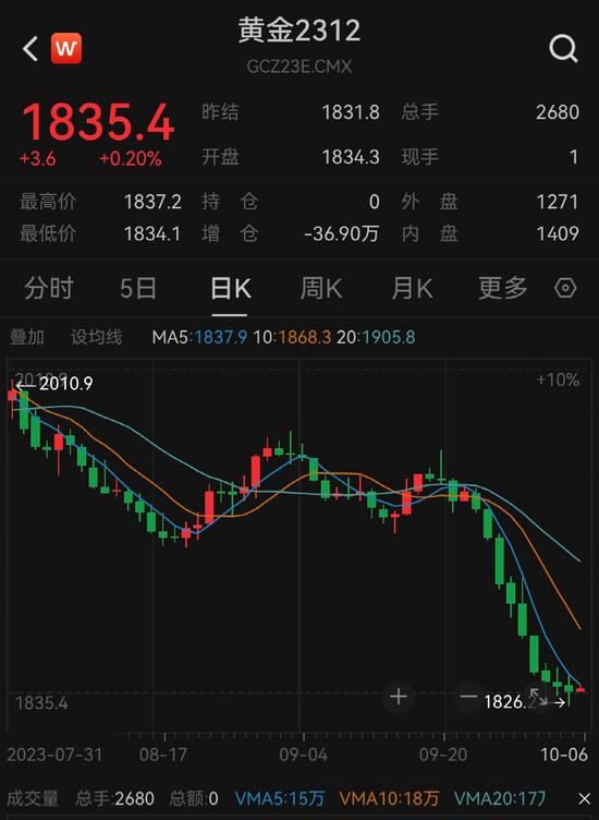 纽约黄金期货价格周四录得连续第九个交易日下跌,周四纽约商品交易所12月交割的黄金期货价格跌幅为0.2%,收于每盎司1831.80美元,目前位于1835.4美元/盎司附近。