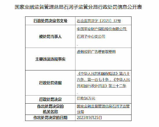 10月7日金融一线消息,国家金融监督管理总局网站近日发布的行政处罚信息公开表显示,中国平安财产保险股份有限公司石河子中心支公司因虚假报销广告费套取费用,被石河子监管分局罚款16万元。
