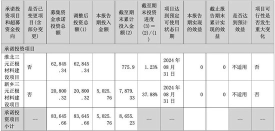 但财报显示,上述项目进度明显不同。截至2023年6月末,淮北项目累计投入775.9万元,投资进度1.23%;新乡项目累计投入7879.33万元,投资进度37.88%;超募资金投向的磷酸铁锂、电池级碳酸锂项目进度较快,前者为72.03%,后者为66.53%。