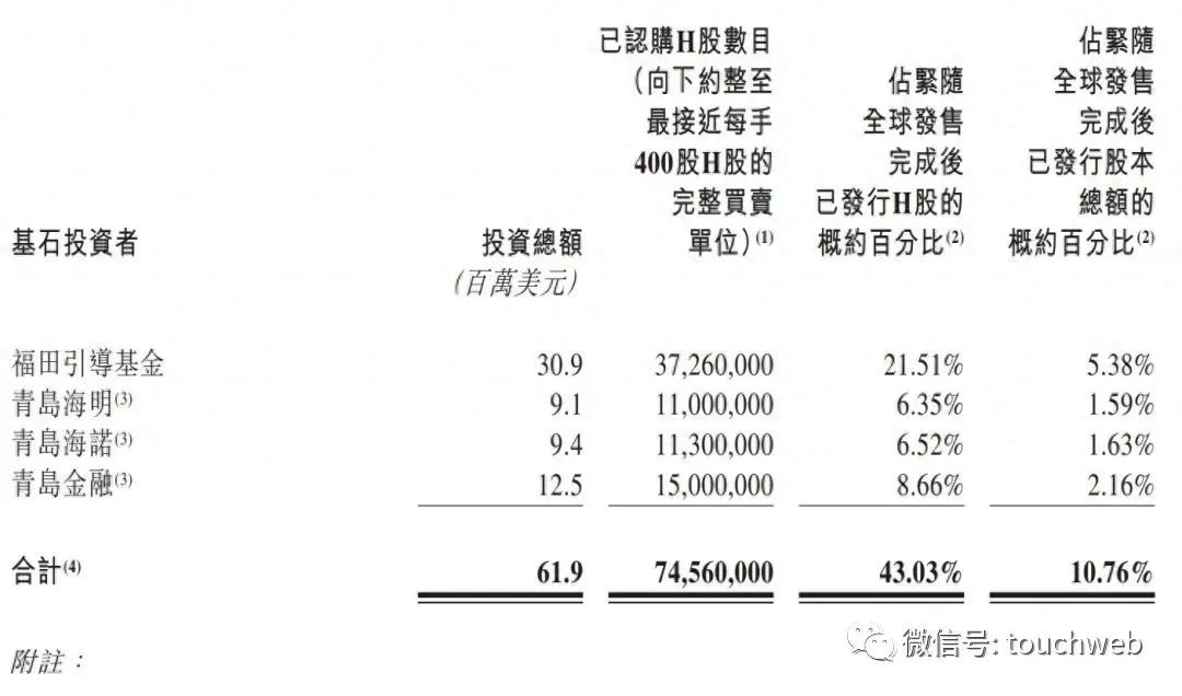 天图投资的基石投资者包括深圳市福田引导基金投资有限公司(“福田引导基金”),青岛海明、青岛海诺及青岛金融(青岛投资者,均由青岛市人民政府最终控制),一共认购6190万美元。