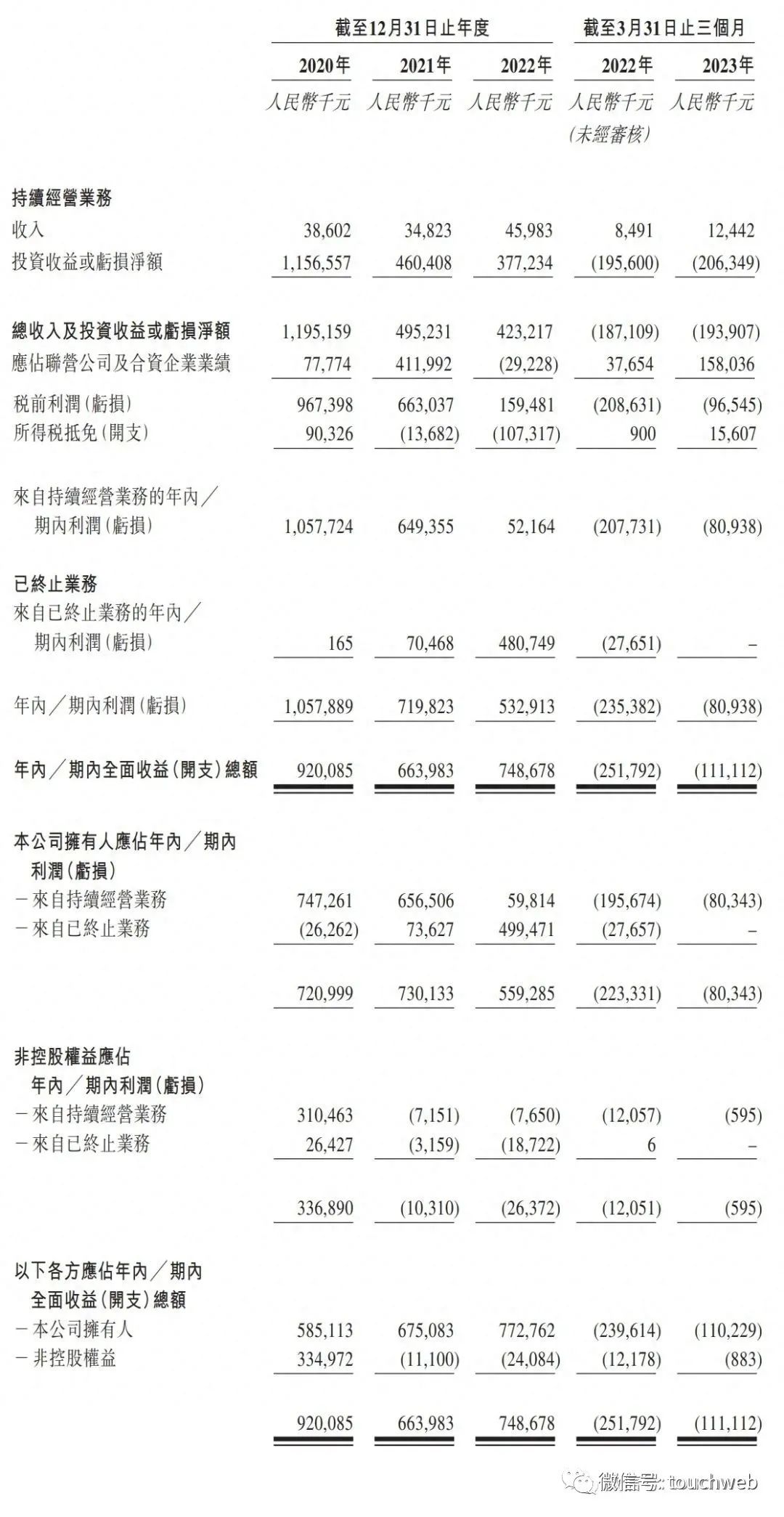 天图投资2023年上半年持续经营业务的期内亏损为1.9亿元,上年同期的期内亏损为8660万元。