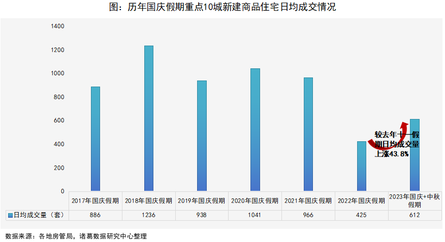 根据中指数据,2023年国庆假期,35个代表城市日均成交面积较去年国庆假期(10月1日-7日)及2019年假期下降两成左右。不过,诸葛数据研究中心监测的重点10个城市新房日均成交612套,较去年国庆假期日均成交量上涨43.8%。
