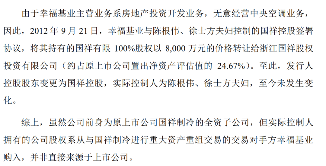 公开信息显示,浙江国祥目前的空调业务来自曾经的上市公司国祥股份。2011年,华夏幸福完成借壳国祥股份,原上市公司董秘徐根伟、文员徐士方夫妇以8000万价格从华夏幸福手中拿下空调资产。最终,陈根伟、徐士方夫妇合计控制浙江国祥65.33%股权。