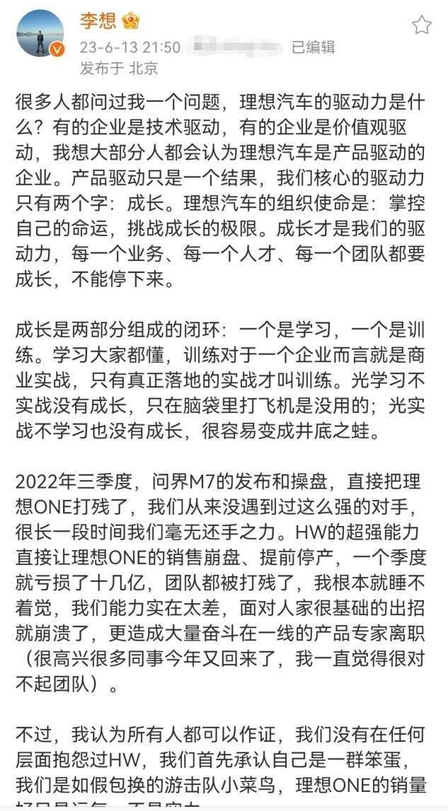 理想汽车创始人李想曾在社交平台上发文提到,“2022年三季度,问界M7的发布和操盘,直接把理想ONE打残”、“华为的超强能力直接让理想ONE的销售崩盘、提前停产,一个季度就亏损了十几亿,团队都被打残了”。