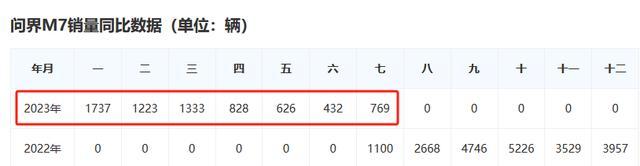 公开数据显示,2023年1月份至7月份,问界M7的销量分别为1737辆、1223辆、1333辆、828辆、626辆、432辆,769辆。前7个月中,有4个月时间销量低于1000辆。