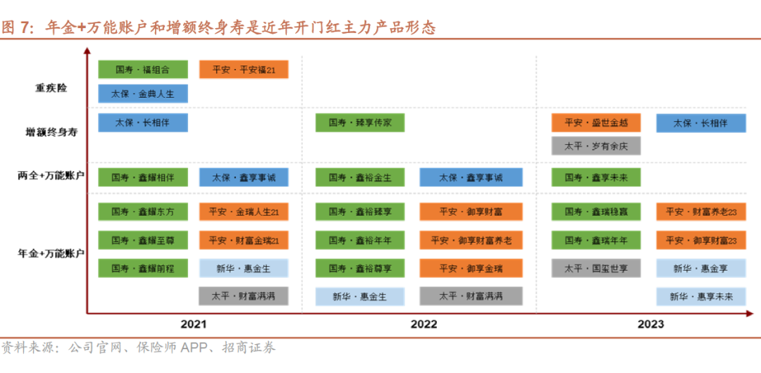 一方面,近年来开门红产品在缴费期和保障期方面有持续缩短趋势,短交快返特征明显,交3保8年金+万能账户是主力产品,能够较好满足客户中短期储蓄需求。