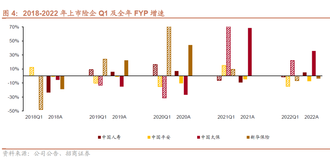 (2)新单保费方面,近五年上市险企Q1FYP占比均超全年的三分之一,2018-2022年平均分别为国寿55.3%>太保43.9%>新华41.6%>平安35.0%(太平未披露)。