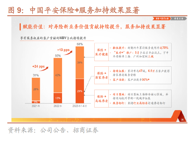 如平安2023年中期业绩报告披露,23H1享有医疗健康、居家养老、高端养老等服务权益的客户贡献NBV占比已提升至68%,活跃使用医疗健康服务客户的客均保费和加保率分别是不使用客户的1.5倍和5倍。