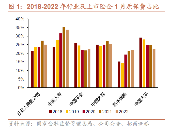(1)原保险保费方面,近五年行业及上市险企1月占比远高于其他月份,2018-2022年行业平均水平为24.2%,上市险企分别为国寿30.4%>太平25.8%>太保25.3%>平安23.3%>新华18.4%。