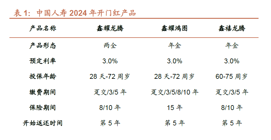 从目前情况来看,一方面对于3.0%预定利率的传统险,国寿已上市的2024年开门红产品主推3年交8年满期“鑫耀龙腾”两全险、3年交8年满期“鑫禧龙腾”年金险,针对老年客群的3年交60岁起领取的“鑫耀年年”养老年金险,以及10年交15年满期“鑫耀鸿图”年金险,匹配当前结算利率4.0%/3.5%万能账户;
