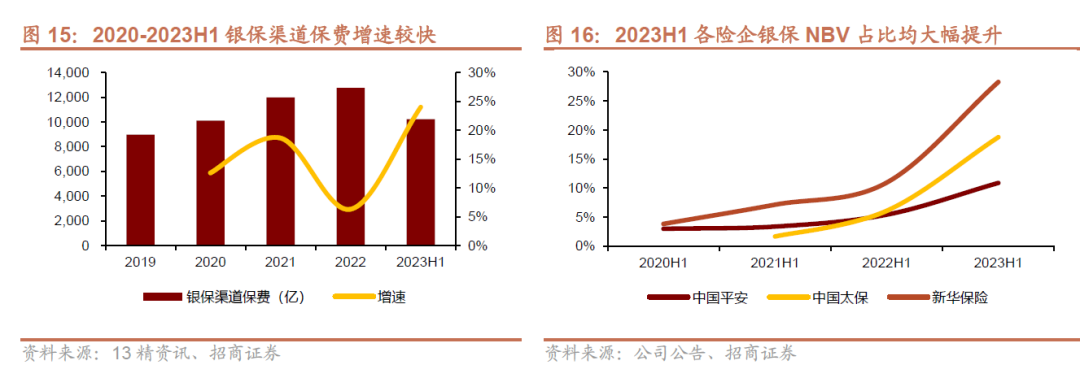 银保渠道方面,近期监管要求严格落实“报行合一”,根治费用乱象,有望推动行业回归理性竞争。近年来,在客户储蓄需求提升、保险公司转移业务压力发力银保渠道、银行提高中收需求迫切三方面共同驱动下,银保渠道再次步入上升通道,2020-2022年行业银保渠道保费CAGR达12.3%,2023上半年同比增长则高达24%,规模和增速均是近年来最高。