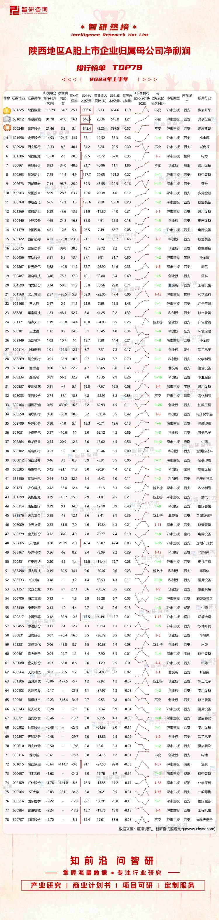 依据榜单可知,陕西煤业是唯一一家归属母公司净利润超过百亿的企业,与2022年上半年相比,再度蝉联冠军,隆基绿能、陕建股份分别以91.78亿元和21.46亿元的蝉联前3,16家企业净利润出现亏损,彩虹股份亏损最多,亏损了2.7亿元。从已知净利润同比增速来看,通源石油、天地源、金钼股份这3家企业增幅超过100%,13家企业净利润转亏为盈,35家企业净利润同比呈现不同程度下滑,晨曦航空降幅最大,转盈为亏,降幅546.39%。
