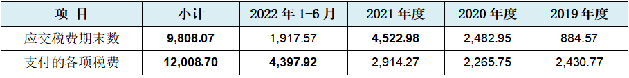 从上表中我们首先就看到一个大漏洞,上表中2021年末应交税费为4,522.98万元,可是上表中的2022年1-6月支付的各项税费仅为4,397.92万元。交的税没有欠的税多?上年度的应交税费过了半年都没交齐,何况2022年1-6月支付的各项税费4,397.92万元还包了括2022年第一季度的企业所得税,1-5月的增值税和个税等。发行人这是向国家税务总局申请了延期交税了吗?还是实在没钱交选择躺平了任罚,要么就是数据乱编乱造,否则绝不会产生如此结果。