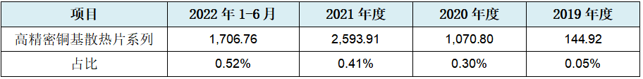 散热铜片业务是发行人三个主业中的最小业务,报告期内收入和占总营收比例见下表: