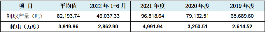 由于发行人铜球生产工艺中涉及到电炉加热,发行人作为一个高能耗企业,其满级能耗与大量冷墩机和低人工、制费不匹配为第三个漏洞。发行人披露的电耗和铜球产量数据,二者如下表所示: