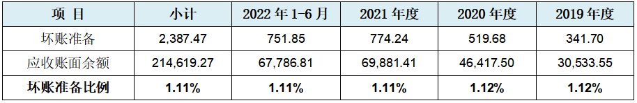 从上表我们通过简单计算就可以知道,发行人2019年-2022年6月末其他应收款计提坏账准备的比例以此为:42.72%、23.97%、22.35%、46.51%,平均值约为28.61%。发行人尚且知道其他应收款都要计提28.61%的坏账准备,反观发行人为何在应收账款上只计提了1.11%的计提坏账准备?一个把钱给人家要人家还钱,一个把货给人家问人家要钱,哪个法律关系简单,哪个风险大不是一目了然的事么,发行人为何却要在应收坏备上选择性装聋作哑?