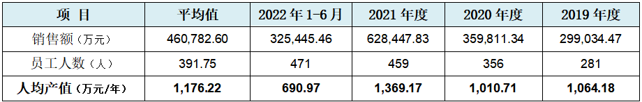 发行人如此高的销售额,而发行人又是生产企业,发行人的人均产值就首先爆掉了。我们整理出发行人的人均年产值情况,如下表所示: