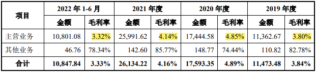 从上表标黄的主营业务毛利率数据我们可以看到,发行人的毛利率居然只有3.32%-4.85%。请大家注意的是这是毛利率而不是净利率,即使这是净利率也都很低。但现在它居然是发行人的毛利率,起初估值之家也是不敢相信自己眼睛的,但它的确就是如此。