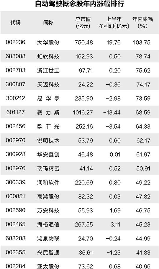 证券时报·数据宝统计,A股中自动驾驶概念股表现显著强于大盘,年内平均上涨22.02%,大华股份、虹软科技、浙江世宝、天迈科技等涨幅居前,均超70%。