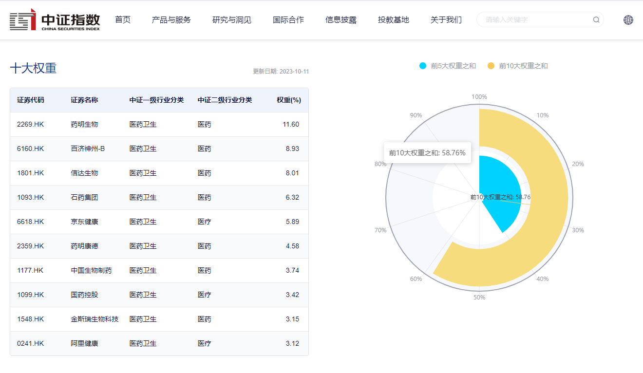 截至2023年10月11日,该指数前十大权重股包括药明生物、百济神州-B、信达生物、石药集团、京东健康等,前十大权重股比重合计约为58.76%。(数据来源:中证指数公司,指数成份股不代表个股推荐)