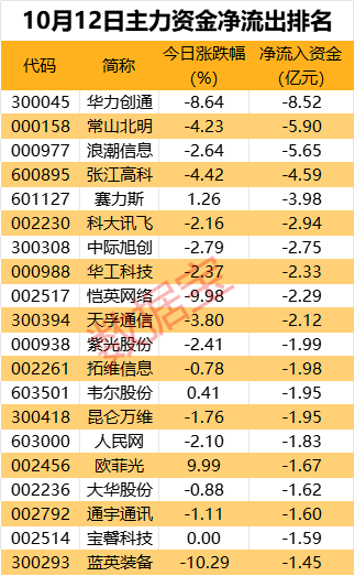 数据宝统计,今日有10股主力净流出超2亿元,华力创通、常山北明、浪潮信息、张江高科主力资金抛售超4亿元居前;赛力斯、科大讯飞、中际旭创、华工科技也遭到抛售。