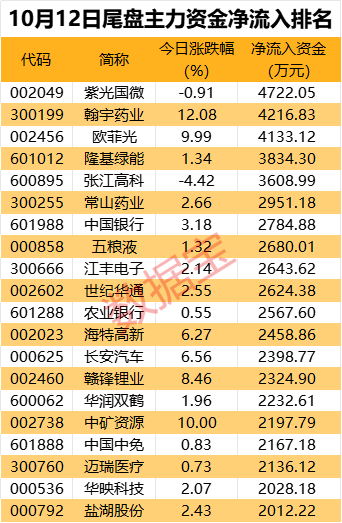 个股方面,紫光国微、翰宇药业、欧菲光、隆基绿能、张江高科5股尾盘主力资金抢筹均超3000万元。