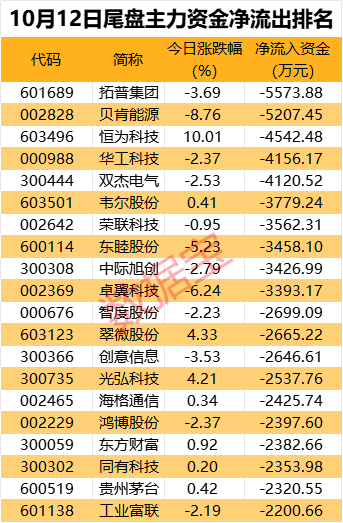 数据宝统计,拓普集团、贝肯能源、恒为科技、华工科技、双杰电气等尾盘主力资金净流出超4000万元。