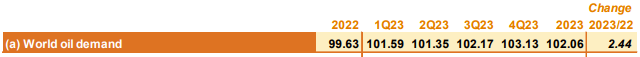 月报显示,欧佩克预计2023年第四季度全球原油需求为1.0313亿桶/日,今年全年平均需求为1.0206亿桶/日,较2022年的增速为244万桶/日。