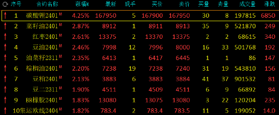 早盘收盘,国内期货主力合约涨跌不一,碳酸锂涨超4%,红枣、菜油涨近3%,豆油、棕榈油、豆粕涨超2%。跌幅方面,工业硅、烧碱、硅铁、玻璃跌超1%。