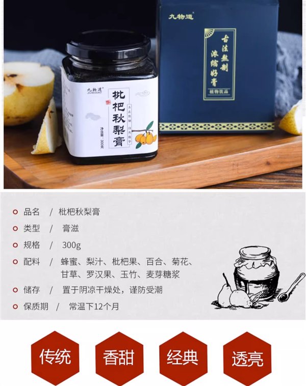 配料包含蜂蜜、梨汁、枇杷果、百合、菊花、甘草、罗汉果、玉竹、麦芽糖浆等,香甜、经典、透亮。