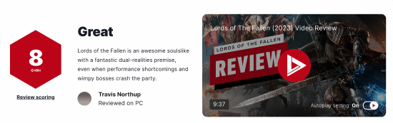 虚幻5类魂游戏《堕落之主》媒体评分现已解禁,IGN为其打出8分的好评,评测者表示这是一款很棒的类魂游戏,有着奇妙的双重现实设定。