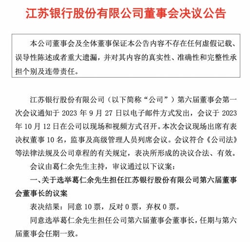 江苏银行日前公告显示,该行于10月12日召开董事会,同意选举葛仁余担任公司第六届董事会董事长,任期与第六届董事会任期一致。