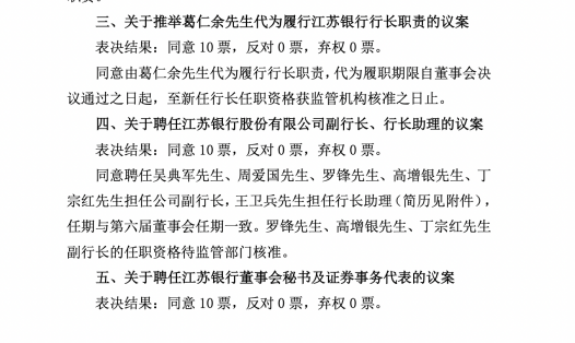 伴随董事长人选落定的,还有江苏银行董事会通过五位副行长聘任议案的消息,即同意聘任吴典军、周爱国、罗锋、高增银、丁宗红担任副行长。