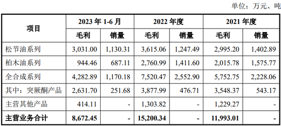 最近一年一期,公司进一步优化产品结构,随着改造升级项目和新建产能陆续完成验收,全合成系列产品产能得以释放,优势产品突厥酮产品市场竞争力进一步发挥,销售收入持续增长;同时,松节油和柏木油系列等传统产品产能提升,公司把握相对较好市场机会的能力提升,使公司具备在某产品市场相对较好时,快速形成规模销售,如,2023年上半年,松节油系列产品市场情况相对较好,公司有能力抓住机会扩大销售。综合使2022年收入和净利润较上年大幅增长,2023年1-6月,公司实现净利润4,255.72万元,较上年同期上涨19.21%。最近二年一期,公司主要产品的销量和毛利情况如下: