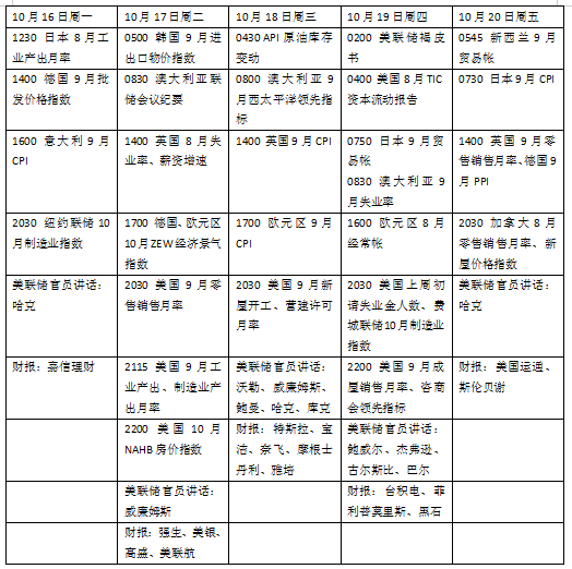 本周看点颇多,中东局势将继续吸引各界目光。美联储将公布褐皮书,最新零售销售数据或影响其对经济判断。英国9月就业和通胀数据同样对央行决策十分关键。财报季进入第二周,特斯拉、奈飞将发布业绩。