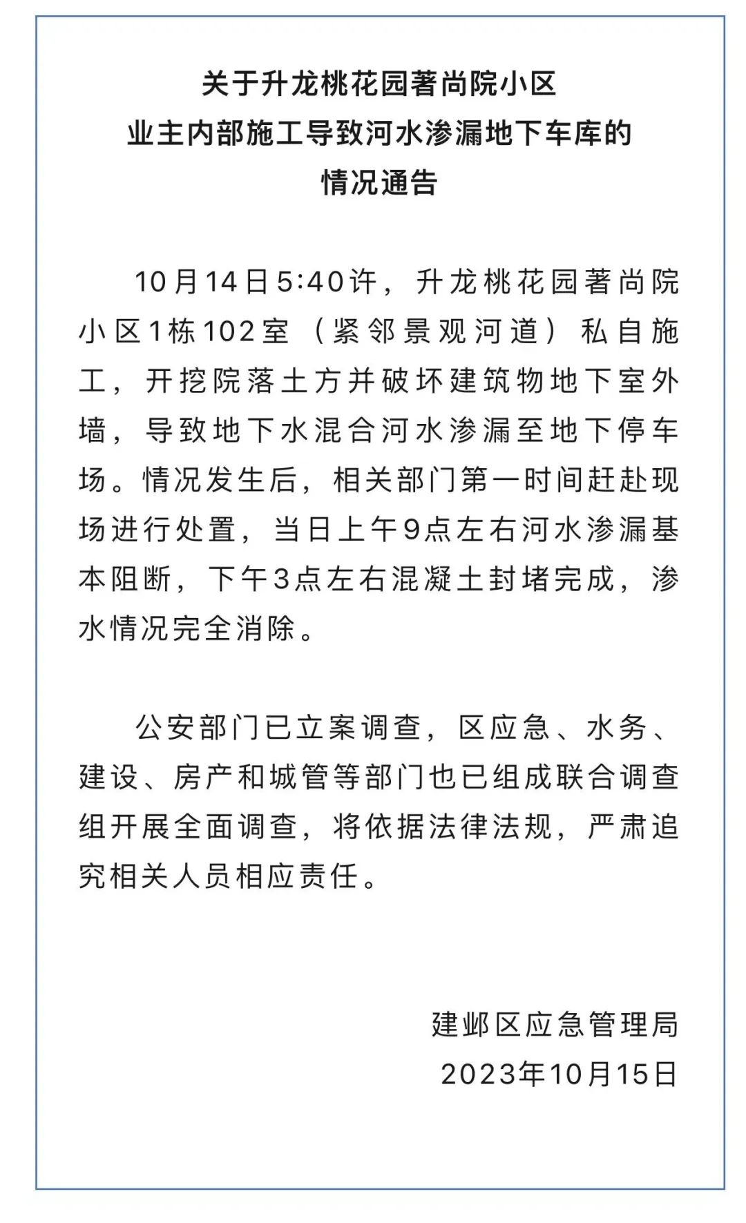 据“建邺播报”微信公众号消息,10月14日5:40许,升龙桃花园著尚院小区1栋102室(紧邻景观河道)私自施工,开挖院落土方并破坏建筑物地下室外墙,导致地下水混合河水渗漏至地下停车场。情况发生后,相关部门第一时间赶赴现场进行处置,当日上午9点左右河水渗漏基本阻断,下午3点左右混凝土封堵完成,渗水情况完全消除。