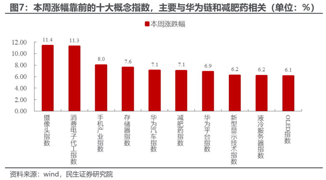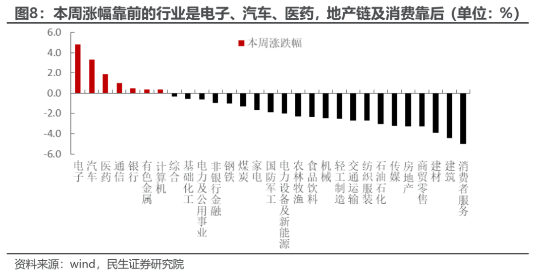 然而从市场表现上来看,投资者们并未对与宏观经济紧密相关的板块报以过多青睐,本周涨幅靠前的领域集中在短期存在产业创新和增量需求逻辑的华为产业链、以减肥药为代表的创新药板块上,经济数据和股票之间的背离值得更多思考,经济的改善幅度和远期预期并未能够带来相关板块成长弹性的回归,尤其是依赖于“量增”的板块;结果是以追逐“量增”成长性为习惯的市场资金,自然剩下两种选择:继续观望或者参与主题投资——以牺牲近期为代价追逐远期成长。市场只在偏价值型的板块中定价经济企稳,这是当下经济缺乏弹性的背景下的选择。