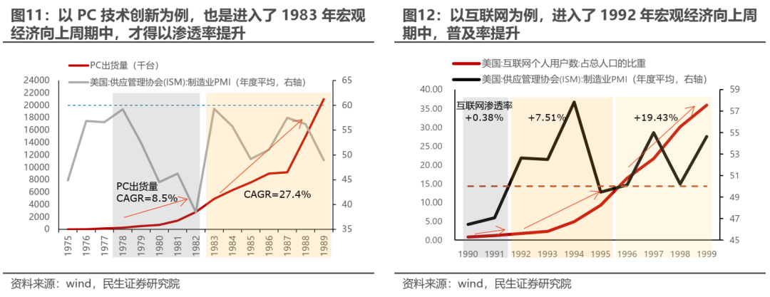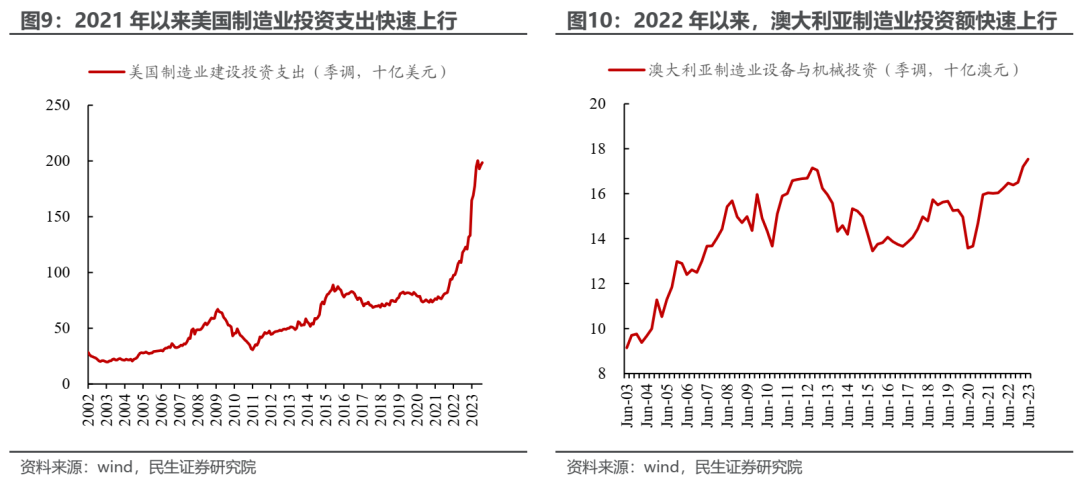 正如全球化不仅仅带来了中国出口产业的繁荣,也带来了经济、劳动力、资产结构的转变一样,理解当前被广泛关注的“逆全球化”也不能仅仅停留在产业层面,我们很难寄希望于某种技术创新能带来增量需求,且能打破当下全球效率降低的趋势:自2020年以来,无论是出于“供应链备份”的需求,或是国家战略的要求,到大量发达国家在加速扭转其“消费国”的角色,不仅仅是广泛被关注到以《IRA》和《CHIPS》法案促进制造业回流的美国,包括英国、澳大利亚等国家在内,均在大量进行工业产能的重建,而产能的重复建设必然带来的是全球角度的产能过剩和资源的紧张,这也是过去“逆全球化”时期的共同特征;另一方面,技术的合作相较过去又更加难以达成,历史经验来看,技术的创新与更迭可以在旧周期的末尾,然而其大规模应用与普及通常需要一个复苏周期,以信息技术为例,在衰退后期,对信息产业的投资增速相对抬升,而随着经济复苏,私人部门对信息产业的相对投资增速进一步上行,在此之后相关创新才开启大幅渗透,各类重大产品与应用开始频繁出现,而在逆全球化的背景下,过去类似于移动互联网浪潮中美国创新——中国应用的全球化分工被打破,新的技术革命似乎缺乏了产业合作基础。全球被“卡在”了一个与以往截然不同的经济周期位置之中——“滞胀”。