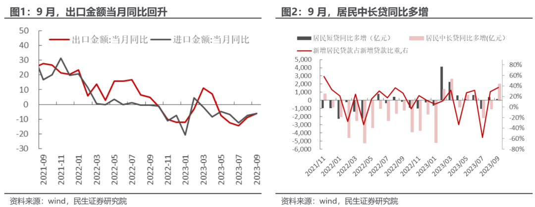从本周公布的经济数据来看,国内经济复苏这一趋势仍然持续:(1)需求端来看,出口仍然具备韧性,9月出口金额当月同比相较8月份回升2.6个百分点至-6.2%,其中,向欧盟出口金额当月同比大幅回升,从8月份的同比-19.58%上升至9月份的-11.61%,这还是在近期欧盟有意向中国发起贸易调查的背景下实现的[1],而在9月份我国的出口结构中,汽车仍然是增量贡献最大的分项,出口金额当月同比上升9.9个百分点至45.1%。(2)从信贷角度来看,居民中长期贷款同比多增,居民“资产负债表收缩”的担忧暂缓,9月份新增社融4.12万亿,社融规模存量同比维持9%,人民币贷款增加2.31万亿,同比少增342亿,其中主要的贡献来源于此前连续同比少增的居民中长贷在9月份同比多增2014亿,这也反映了在多项房地产政策的帮助下,居民“提前还贷潮”或许已经有所缓解,而信贷的拖累则存在于企业端的走弱,企业信贷连续三个月同比少增,反映了实体经济中复苏仍然较慢,难以驱动企业加杠杆,这也体现在了“M1:同比”与“M2:同比”剪刀差虽然有所回升但仍处在历史低位。(3)从价格角度来看,CPI同比受食品项拖累有所回落;而PPI同比继续回升,其中采掘和原材料工业环比超越季节性,体现当前产业链上的紧张环节仍在上游。