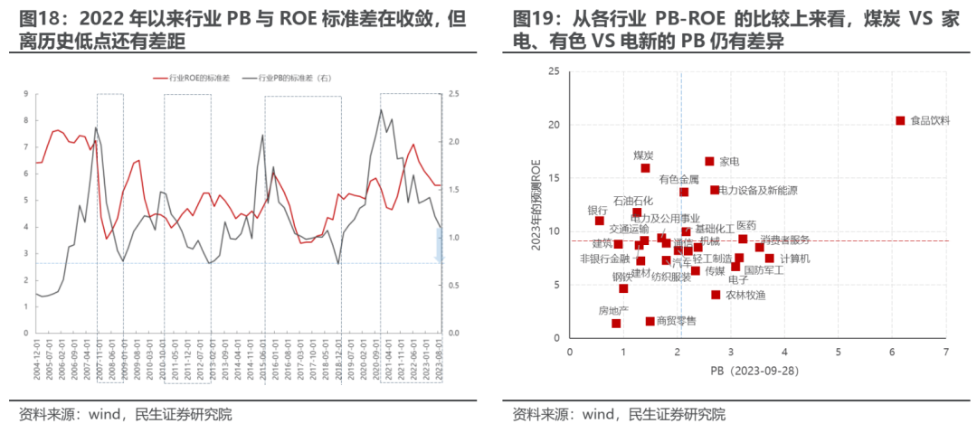 从企业的角度来看,如果资产周转率的提升变得困难,所能够依赖的无非是价格的回升,而这将带来部分价格驱动型行业ROE和分红的优势,这也使得在进行估值比较时,需要重视的并不相对历史“贵”,而是需要重视相同ROE下PB如何收敛。以A股为例,历史上一级行业之间的ROE标准差开始收敛之后往往都会伴随着PB标准差收敛,这一轮也不例外,当前两者的标准差距离历史低点还有一定下行空间,具体到行业来看,还有很多行业ROE相近,但是PB差异较大:比如煤炭VS家电、有色VS电新等。对于ROE的不同PB定价无非隐含的是市场投资者对于未来的判断能力,在动荡世界下,对这一能力的依赖应该天然下降。