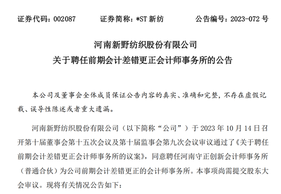 因为需要对前期会计差错进行更正,A股老牌纺企*ST新纺(维权)(002087)拟新聘会计师事务所——河南守正创新会计师事务所(普通合伙)。官网显示,这家会计师事务所成立于2020年。