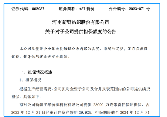 15日晚间,*ST新纺还发布了对多家公司提供担保额度的公告,拟对全资子公司及合并报表范围内的公司提供续贷担保。其中,对新疆宇华纺织科技有限公司提供28000万连带责任保证担保,占2022年12月31日经审计净资产额的39.92%,担保期限截至2024年12月31日,在同日公布的所有担保中,连带责任保证担保金额最大。