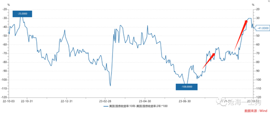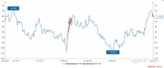 在这一轮冲击过程中,美债的期限利差显著攀升,十年两年美债的期限利差一度收窄至-30bp。