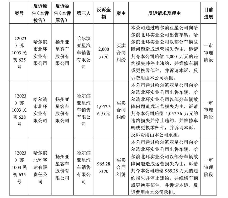 但是哈尔滨北环实业公司、哈尔滨北环客运公司向法院提起反诉,理由为,亚星客车通过哈尔滨亚星公司出售的部分车辆,因故障问题造成运营损失,要求亚星客车赔偿相关损失,目前该案在一审阶段