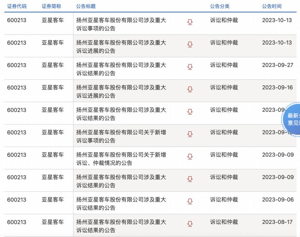 近日,扬州亚星客车(600213)公布两则涉及重大诉讼进展的公告,或受诉讼纠纷消息影响,截至10月13日收盘,亚星客车股价下跌1.57%,报收9.38元/股,现市值约为26.83亿元。