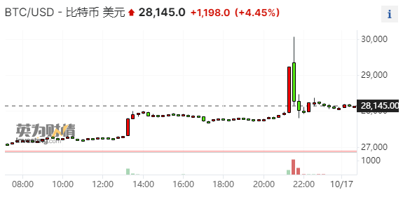 周一(10月16日)美股开盘前附近,加密货币突然暴涨,其中比特币一度从每枚28,000美元不到拉升至30,000美元,日内涨幅最高超10%,随后快速回落至28,000美元附近。