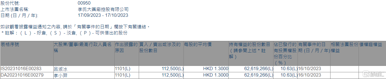 格隆汇10月17日丨根据联交所最新权益披露资料显示,2023年10月16日,李氏大药厂(00950.HK)获非执行董事李小羿在场内以每股均价1.30港元增持11.25万股,涉资约14.63万港元。