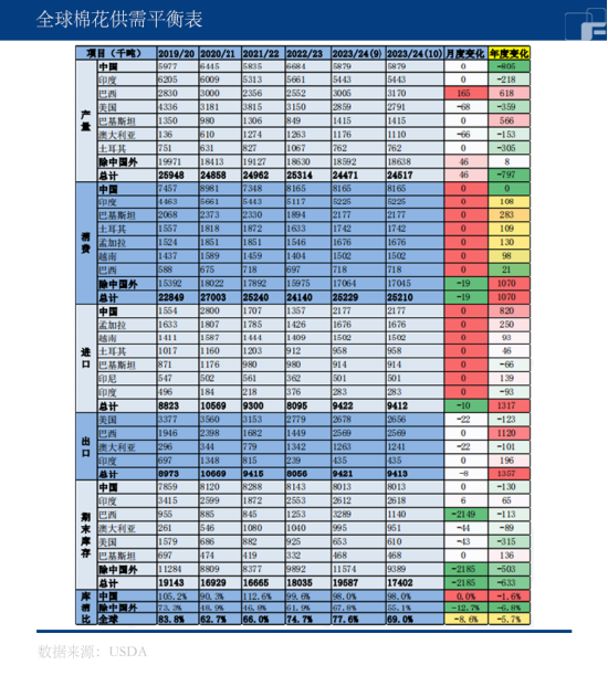 先从全球整体来看,美国农业部发布10月全球棉花供需报告,23/24年度全球棉花产量预估值较上月上调4.6万吨至2451.7万吨,全球消费预估值下调1.9万吨至2521万吨,期末库存预估下调218.5万吨至1740.2万吨。2023/24年度全球棉花消费调减、期末库存调减,产量上调,数据略微利多。USDA将巴西历史数据进行年度错位,将22/23年度的数据变为23/24年度,实际影响不大。此外,在需求上23/24全球消费大幅回升存疑,USDA已着手下调消费。未来的变数,上游在于印度产量的变化,下游在于全球消费的下调。