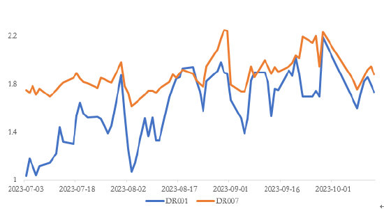 节后银行间资金面转松,质押式回购利率下降。10月13日DR001、DR007、DR014分别报收1.74%、1.88%、2.00%,较9月28日收盘分别变化-46bp、-35bp、-122bp。